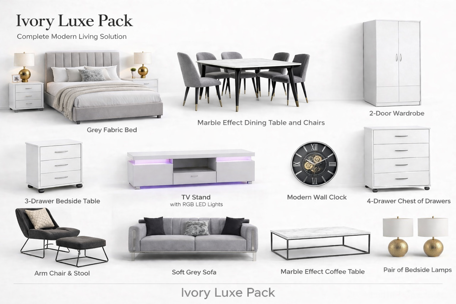 Our Ivory Luxe furniture package offers a soft, elegant finish, available for one, two, and three-bedroom properties. Designed to create a light, refined aesthetic, this collection blends timeless neutral tones with luxurious detailing—perfect for bright, sophisticated interiors.
