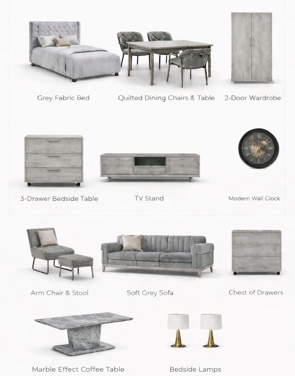 Our Urban Graphite furniture package offers a sleek, contemporary finish, available for one, two, and three-bedroom properties. Crafted to bring a bold yet sophisticated look, this collection blends modern design with premium detailing—ideal for stylish, high-quality interiors.